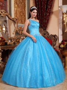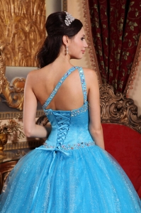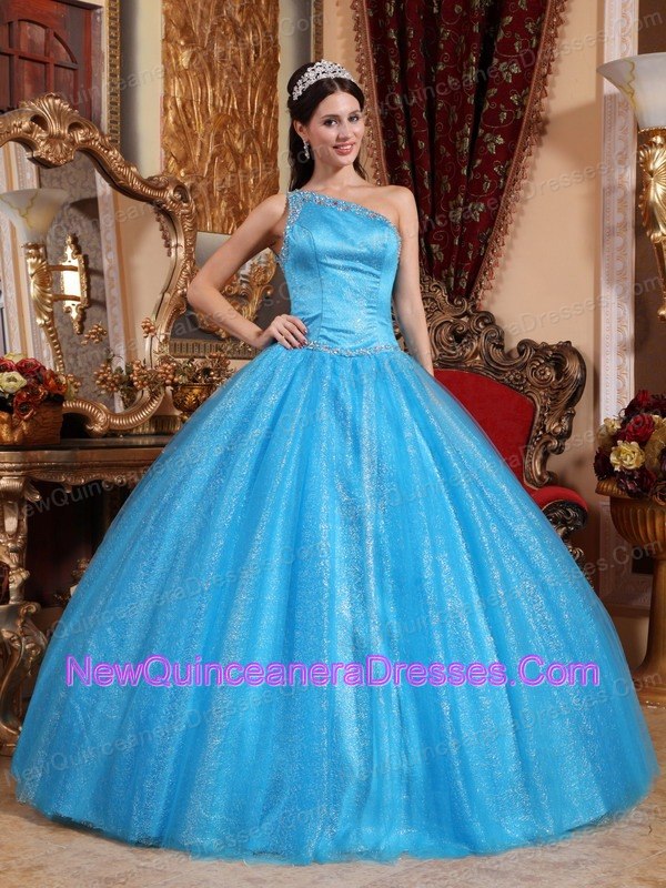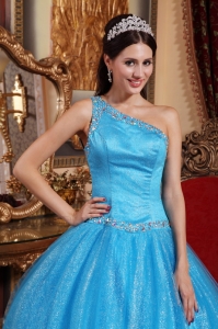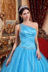 free shipping quinceanera dress, New Baby Blue Quinceanera Dress One Shoulder Tulle and Taffeta Beading Ball Gown