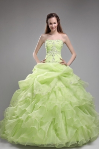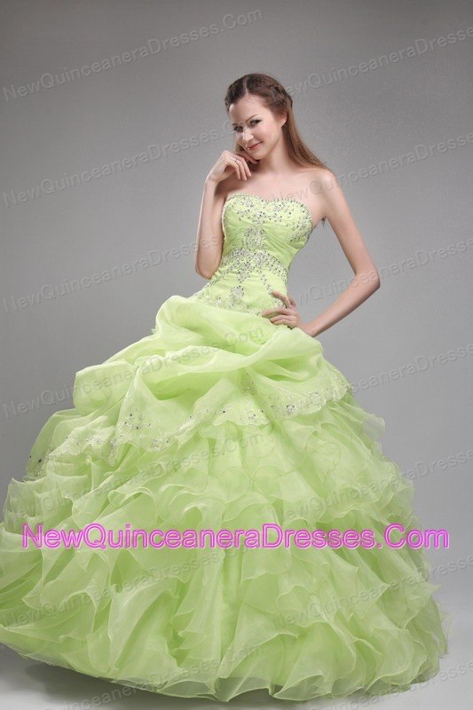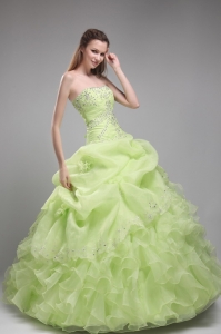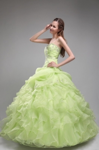 yellow green quinceanera dresses with ruffles, Romantic Yellow Green Quinceanera Dress Strapless Orangza Beading and Ruffles Ball Gown