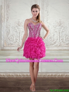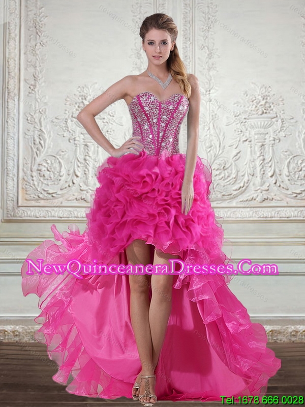 2015 Hot Pink High Low Sweetheart Dama Dresses with Beading and Ruffles