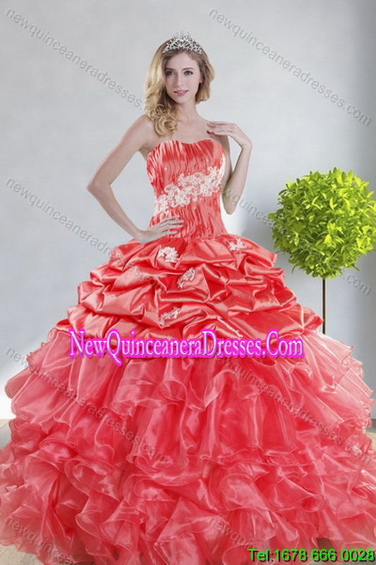 2015 Top Seller Watermelon Red Quince Dresses with Appliques and Ruffles