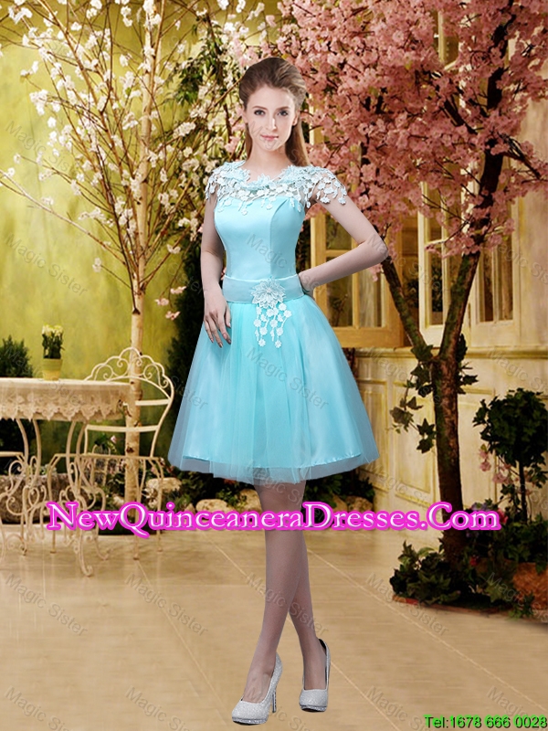 2016 Fall Perfect Scoop Beaded Cheap Damas Dresses with Appliques in Aqua Blue