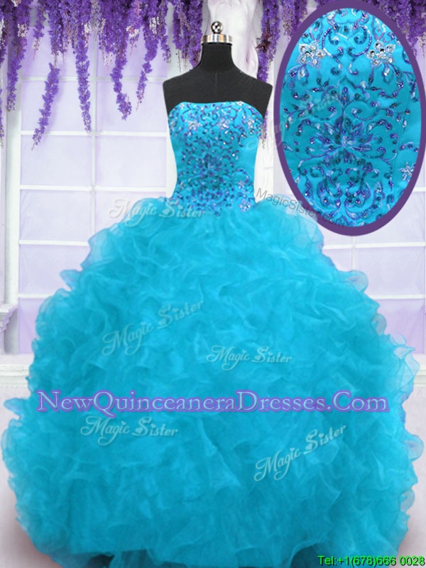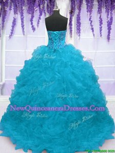 Admirable Aqua Blue Lace Up Sweet 16 Dresses Beading and Ruffles Sleeveless With Brush Train