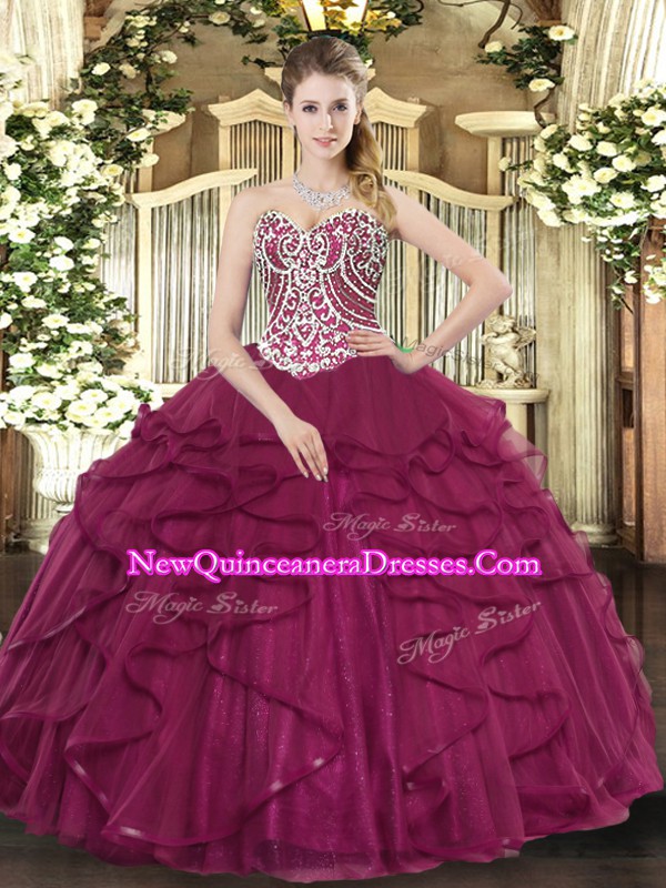 Admirable Burgundy Lace Up Sweetheart Beading and Ruffles Quinceanera Dresses Tulle Sleeveless