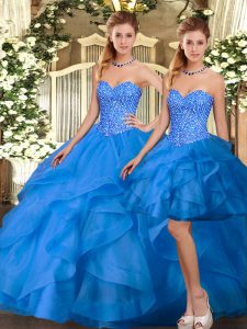 Adorable Floor Length Lace Up Sweet 16 Quinceanera Dress Blue for Military Ball and Sweet 16 and Quinceanera with Beading and Ruffles
