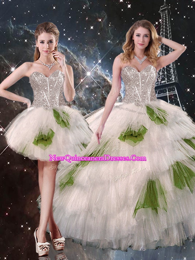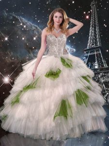 Affordable White Sweetheart Neckline Beading and Ruffled Layers and Sequins Quinceanera Gowns Sleeveless Lace Up