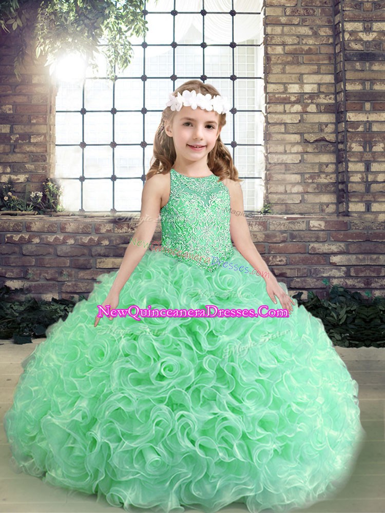 Apple Green Column/Sheath Scoop Sleeveless Organza Floor Length Lace Up Beading and Ruffles Pageant Gowns For Girls