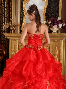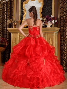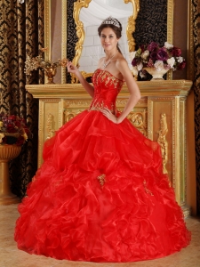 Pretty Red Sweet 16 Dress Strapless Appliques Organza Ball Gown
