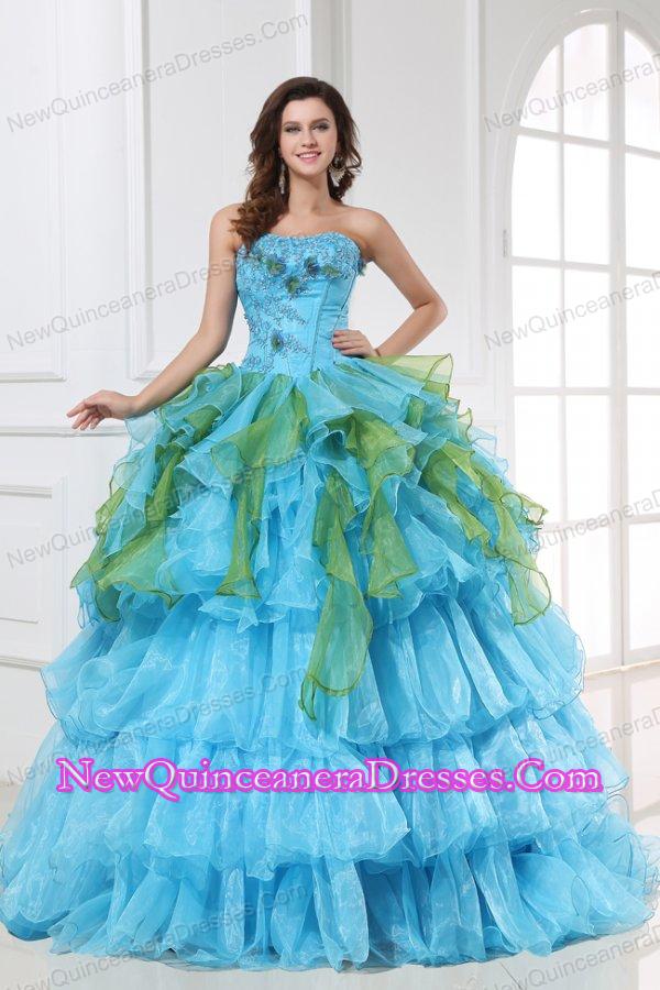 well-packaged multi-color quinceanera dress with appliques and ruffles,