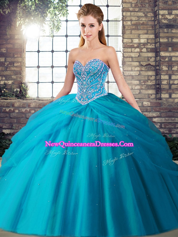 Aqua Blue Lace Up 15th Birthday Dress Beading and Pick Ups Sleeveless Brush Train