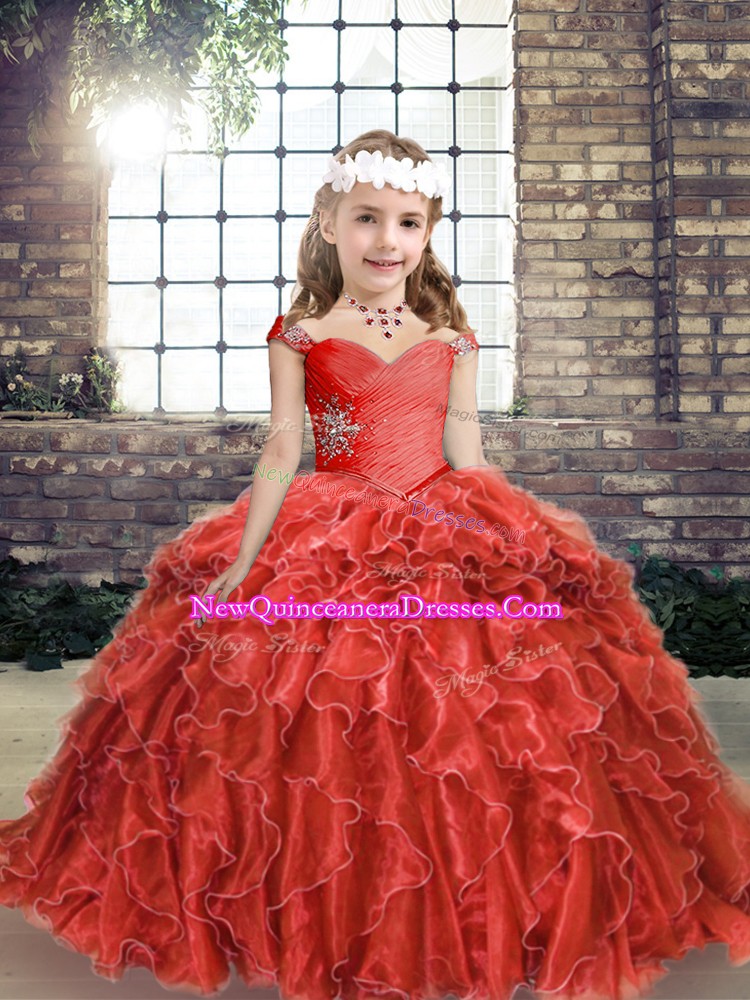 Embroidery and Ruffles Girls Pageant Dresses Red Lace Up Sleeveless Floor Length