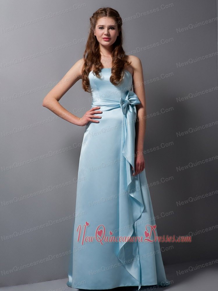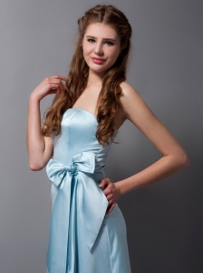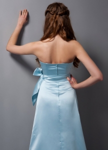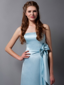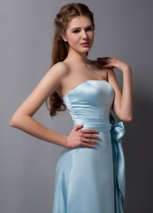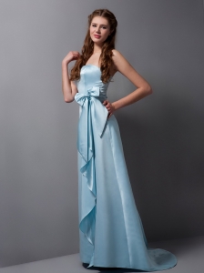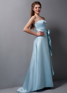 Baby Blue Column Strapless Brush Train Satin Bow Dama Dress