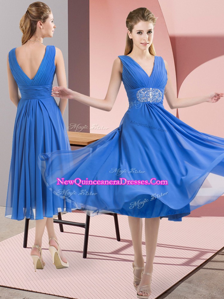 Baby Blue Sleeveless Knee Length Beading Side Zipper Vestidos de Damas