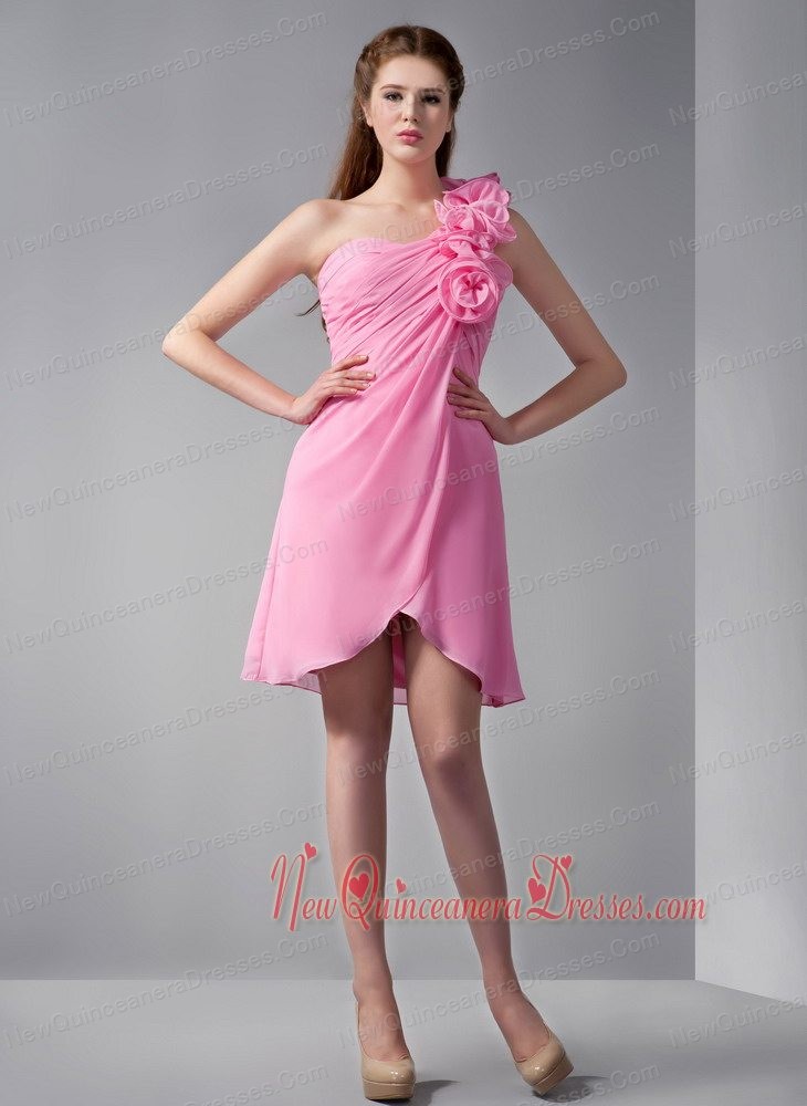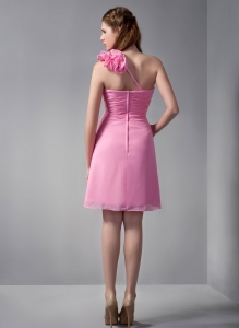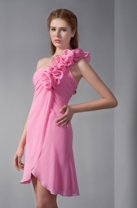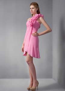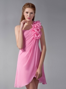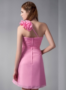 Baby Pink Empire One Shoulder Mini-length Chiffon Hand Made Flowers Dama Dresses for Quinceanera