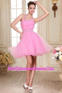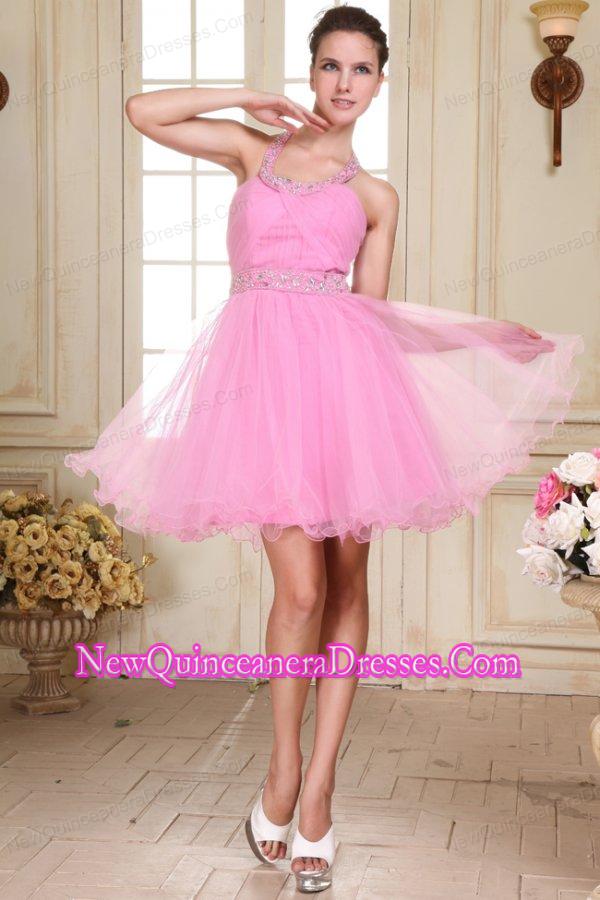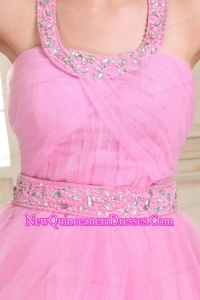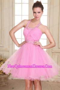 Rose Pink Halter Top Neck Mini-length Beading Dama Dress for Quinceanera with Organza