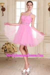 Baby Pink Halter Top Neck Mini-length Beading Dama Dress for Quinceanera with Organza