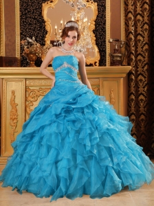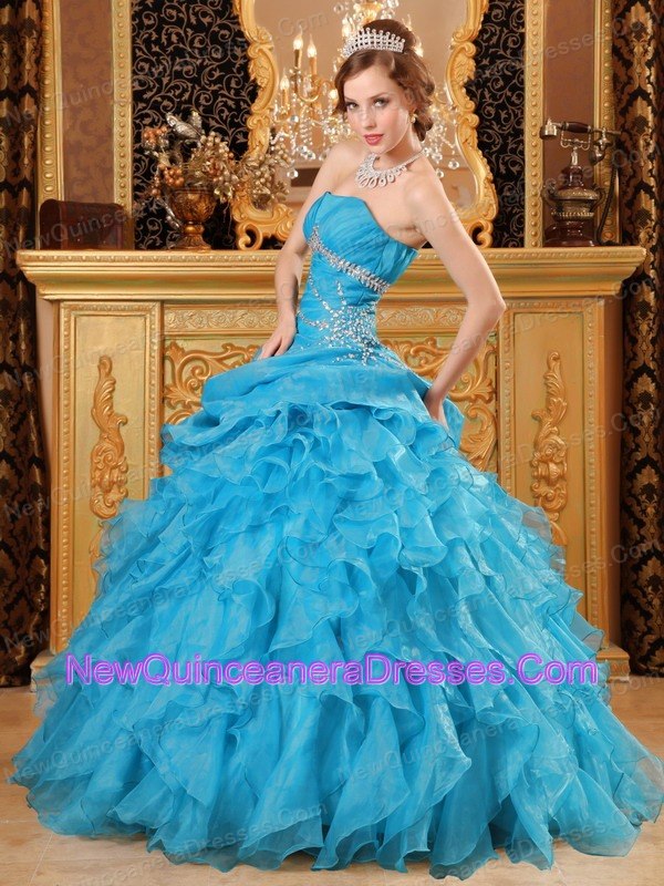 Inexpensive Sky Blue Quinceanera Dress Organza Beading And Ruffles Ball Gown