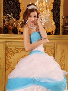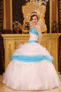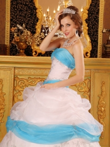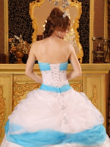 Perfect White and Aqua Quinceanera Dress Strapless Appliques Satin and Organza Ball Gown