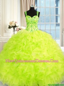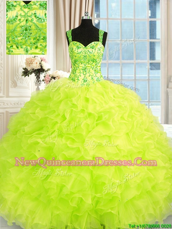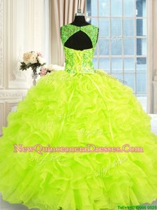 Beauteous Yellow Green Ball Gowns Beading and Embroidery and Ruffles Quinceanera Gown Lace Up Organza Sleeveless Floor Length