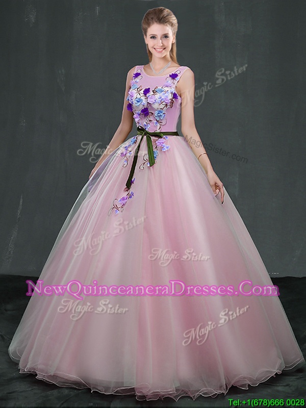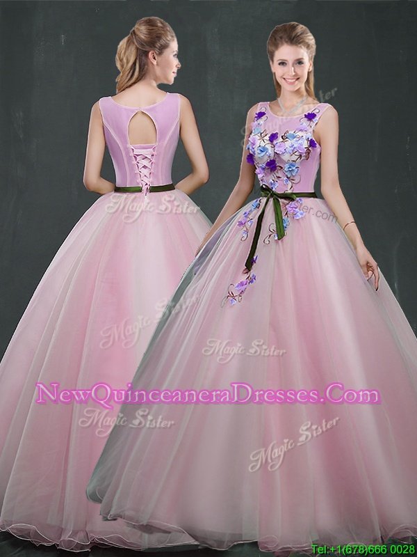 Beautiful Scoop Appliques Quince Ball Gowns Pink Lace Up Sleeveless Floor Length