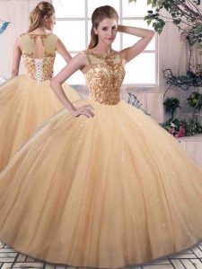Best Gold Ball Gowns Beading 15th Birthday Dress Lace Up Tulle Sleeveless Floor Length