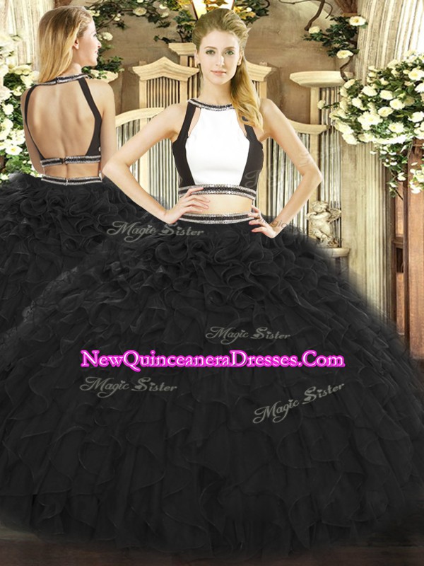 Black Two Pieces Tulle Halter Top Sleeveless Ruffles Floor Length Backless Quinceanera Gowns