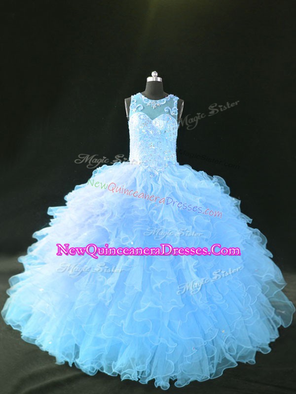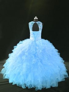 Blue and Light Blue Organza Lace Up Scoop Sleeveless 15th Birthday Dress Appliques and Ruffles
