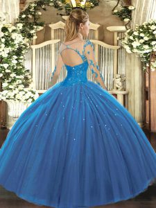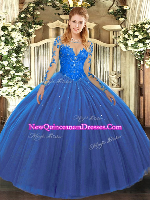 Blue Long Sleeves Floor Length Lace Lace Up Sweet 16 Dress