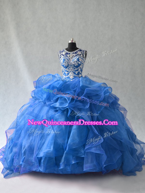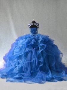 Blue Organza Lace Up Quinceanera Gowns Sleeveless Floor Length Beading and Ruffles