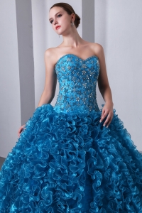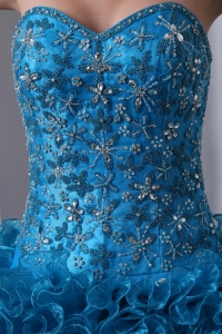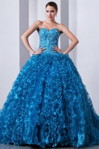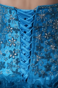 sweetheart quince dresses, Sky Blue A-Line / Princess Brush Train Beading and Ruffles Quinceanea Dress Sweetheart Organza