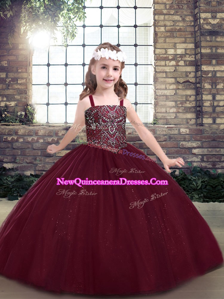 Burgundy Lace Up Straps Beading Little Girls Pageant Dress Wholesale Tulle Sleeveless