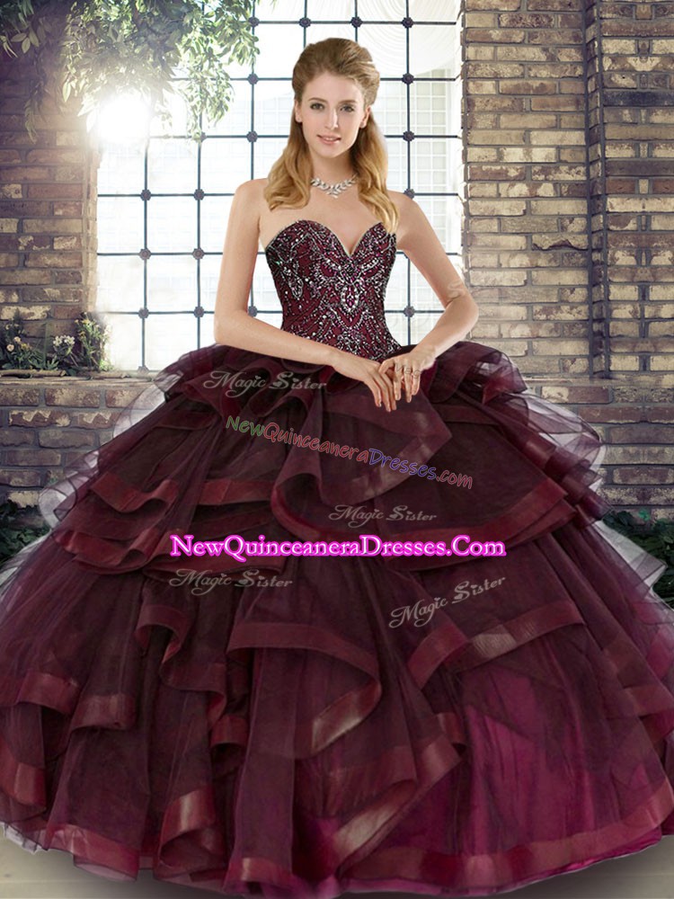 Burgundy Sleeveless Beading and Ruffles Floor Length Quinceanera Gowns