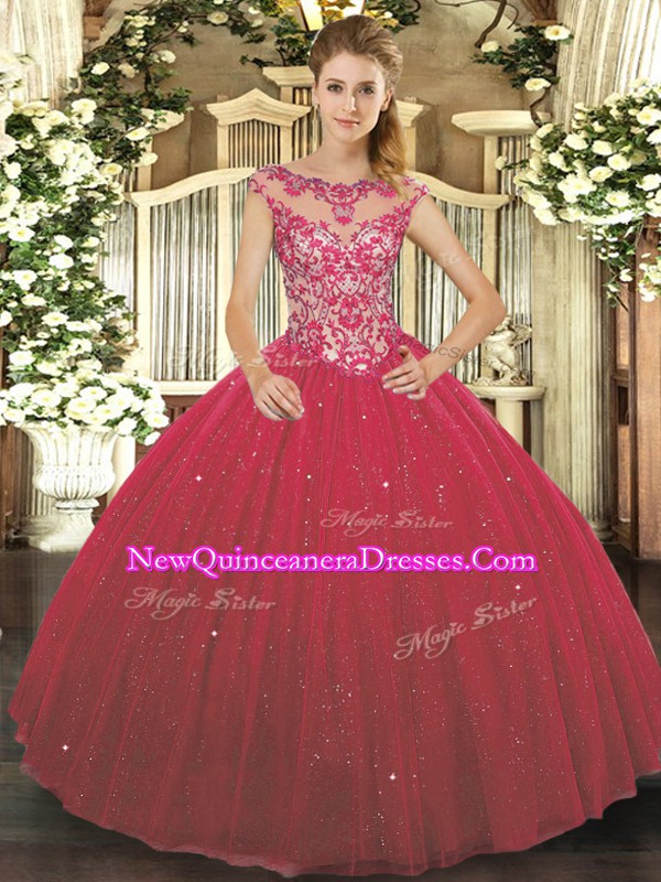 Captivating Scoop Cap Sleeves Tulle Quinceanera Dress Beading and Appliques Lace Up