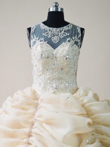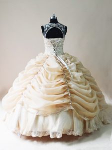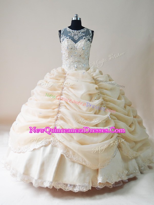 Champagne Ball Gowns Organza Scoop Sleeveless Lace and Appliques Floor Length Lace Up Quinceanera Gown