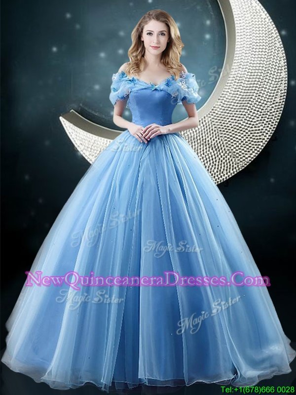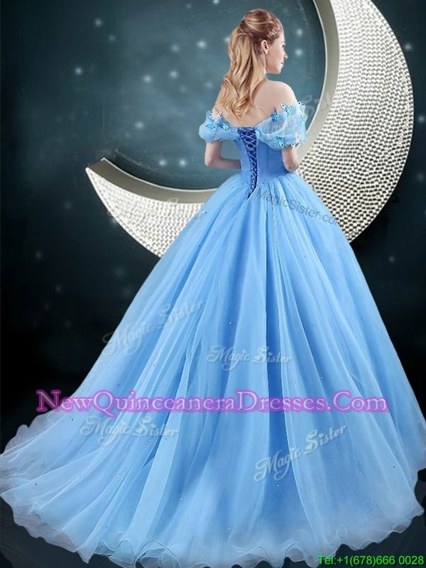 Charming Off the Shoulder Sleeveless Organza With Brush Train Lace Up Sweet 16 Dresses inBaby Blue withAppliques