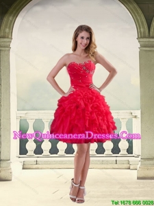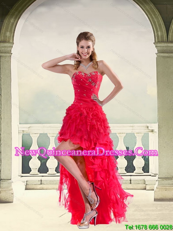 Cheap Coral Red High Low Strapless Dama Dresses with Ruffles and Beading