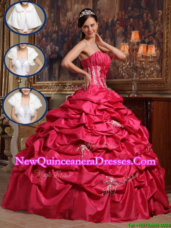 Cheap Coral Red Strapless Quinceanera Gowns with Appliques