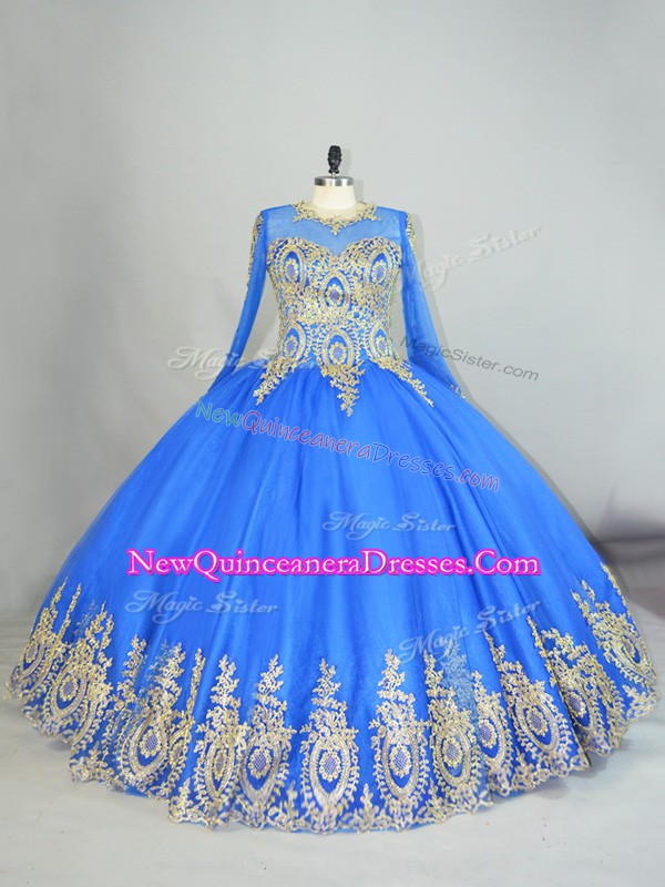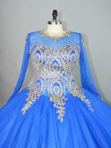 Cheap Floor Length Blue 15 Quinceanera Dress Tulle Long Sleeves Beading and Appliques