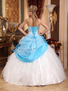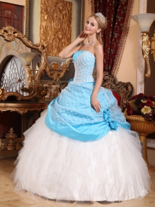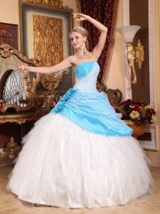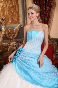 blue strapless quinceanera dress, Beautiful Aqua Blue and White Quinceanera Dress Strapless Taffeta and Tulle Hand Made Flowers Ball Gown