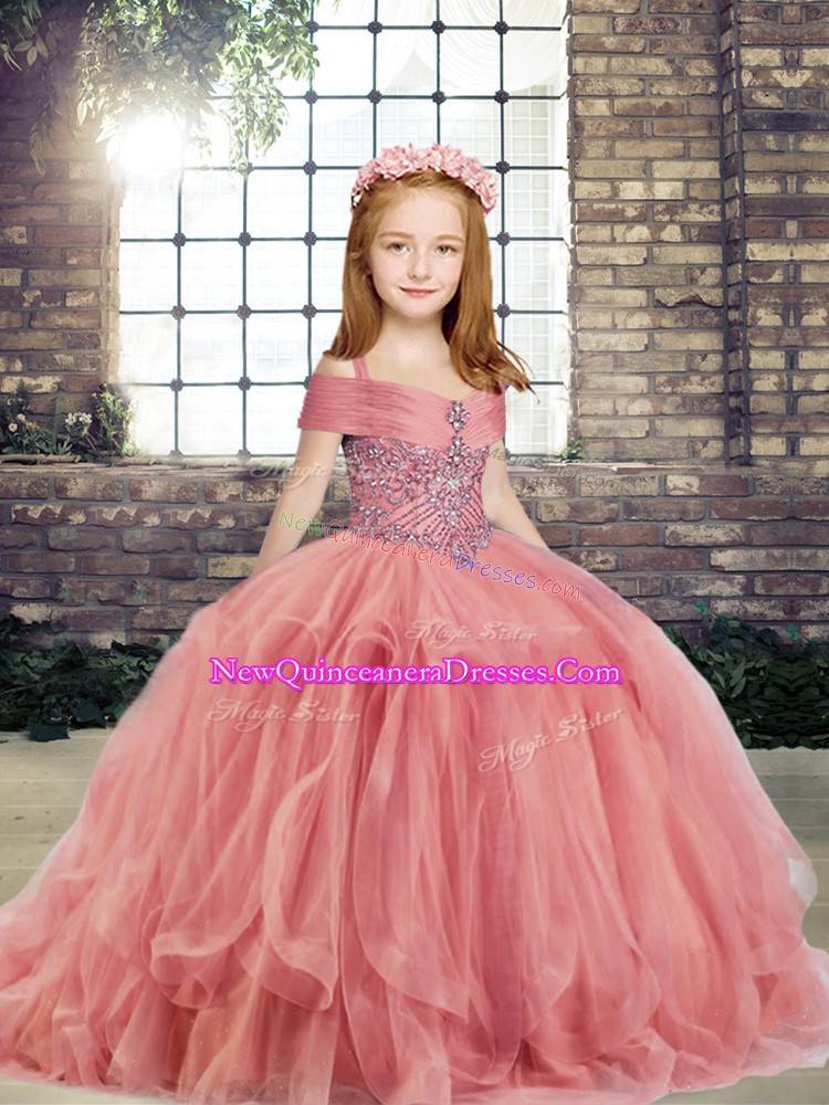 Cheap Watermelon Red Sleeveless Beading Floor Length Little Girls Pageant Dress