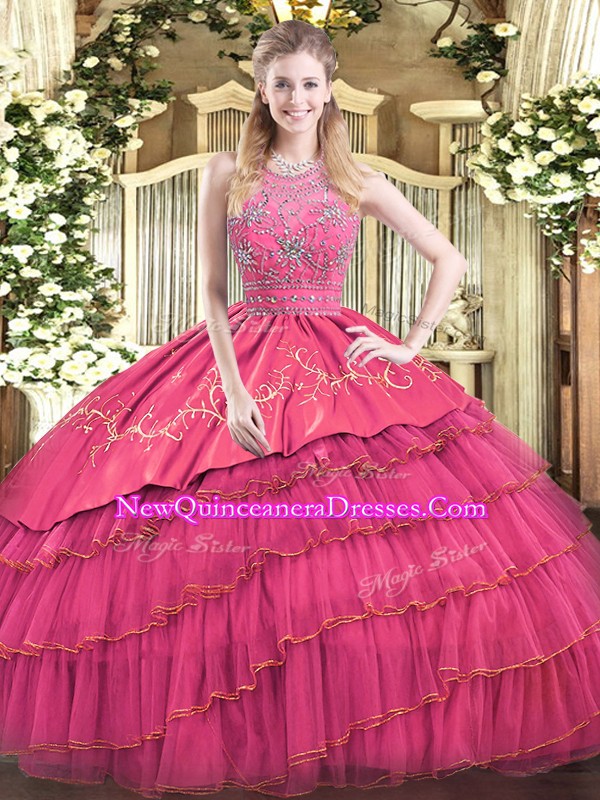 Chic Hot Pink Ball Gowns Satin and Tulle Halter Top Sleeveless Beading and Embroidery and Ruffled Layers Floor Length Zipper Sweet 16 Dress