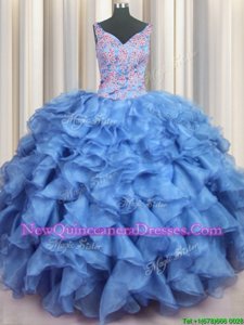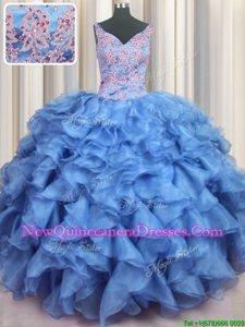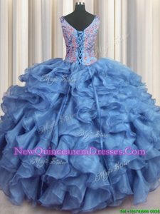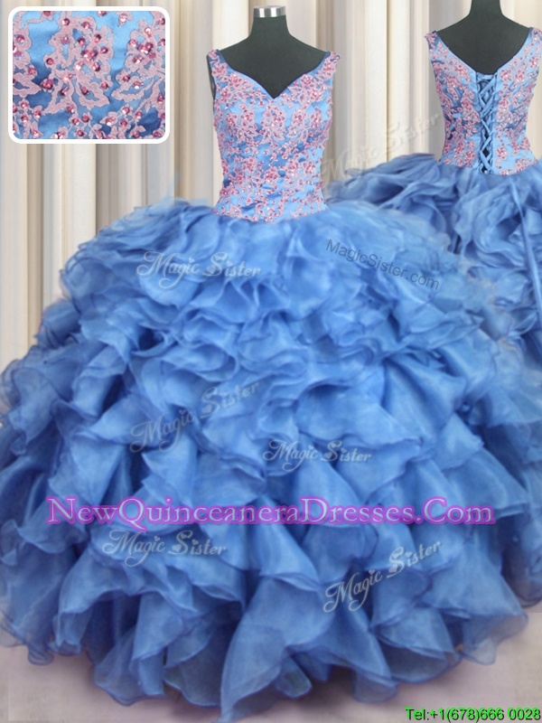 Chic Ruffled V Neck Organza V-neck Sleeveless Lace Up Appliques and Ruffles Ball Gown Prom Dress inBaby Blue