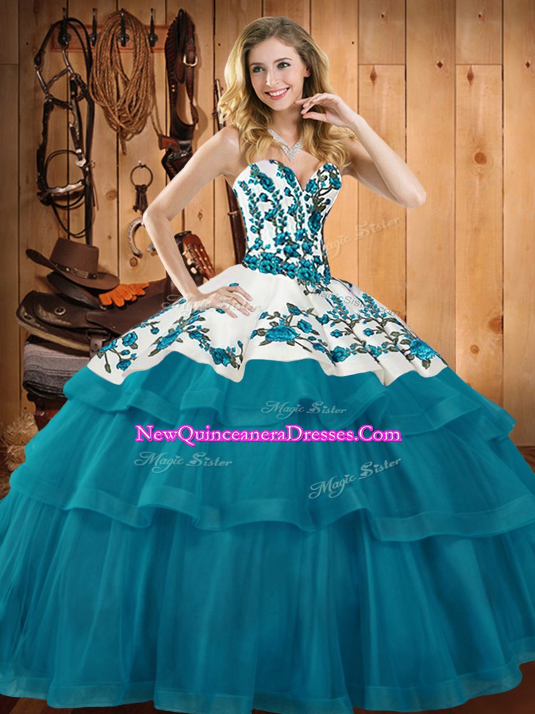 Chic Sweetheart Sleeveless Ball Gown Prom Dress Sweep Train Embroidery Teal Organza