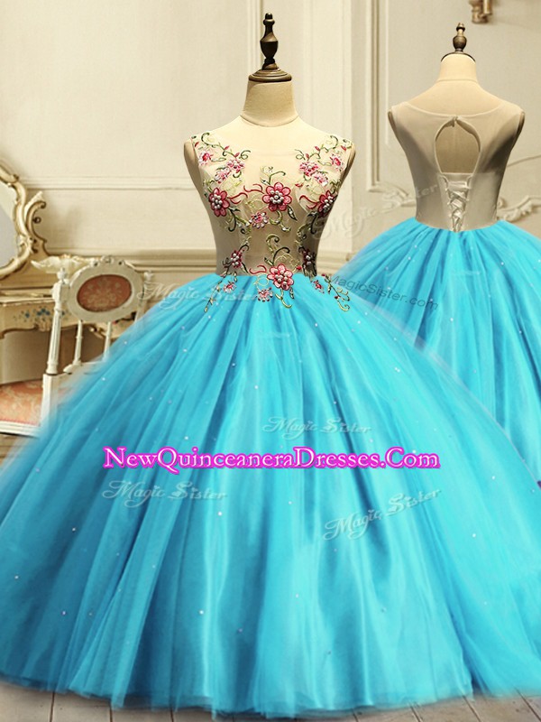 Latest Scoop Sleeveless Tulle Quinceanera Gown Appliques Lace Up