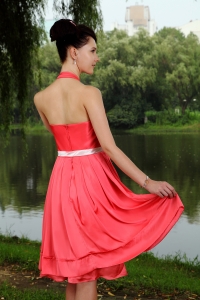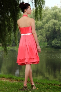 Coral Red Empire Halter Knee-length Taffeta Sashes Dama Dresses for Quinceanera