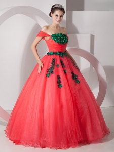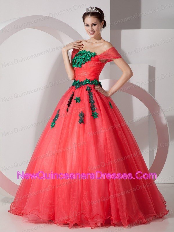 dress, Pretty Coral Red Princess Off The Shoulder Prom Dress Organza Appliques