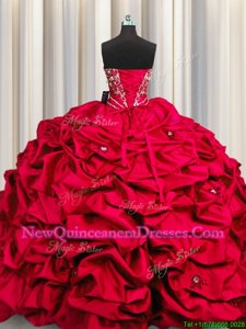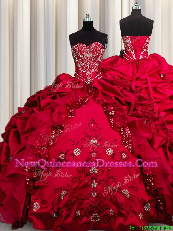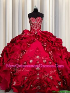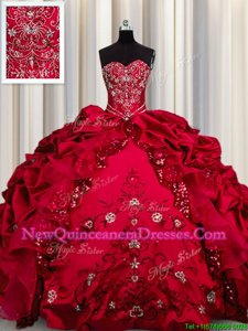 Custom Designed Embroidery Sequins Sweetheart Sleeveless Quinceanera Gowns Floor Length Beading and Appliques and Ruffles Red Taffeta
