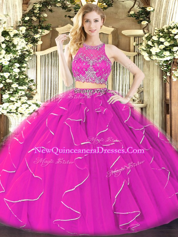 Custom Fit Floor Length Fuchsia 15th Birthday Dress Organza Sleeveless Ruffles