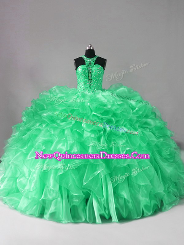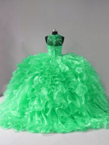 Custom Fit Green Organza Lace Up Halter Top Sleeveless Ball Gown Prom Dress Brush Train Beading and Ruffles