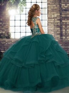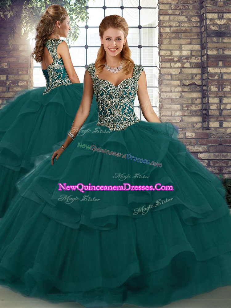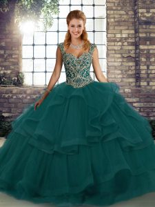 Custom Fit Peacock Green Tulle Lace Up 15 Quinceanera Dress Sleeveless Floor Length Beading and Ruffles