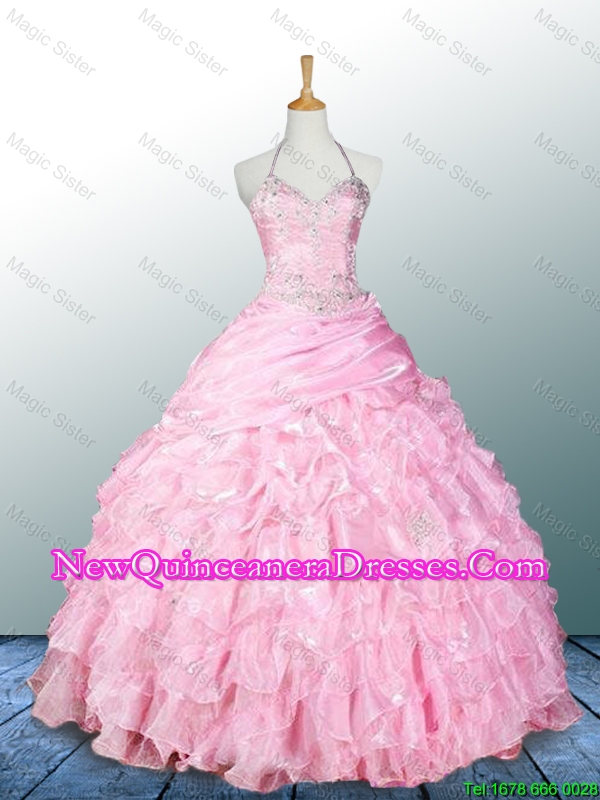 Custom Made Halter Top Pink Quinceanera Dresses with Appliques
